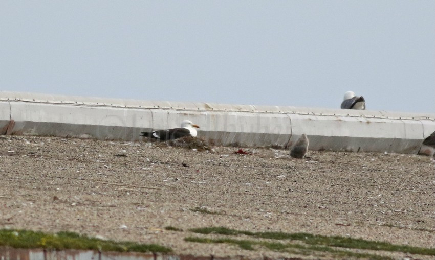 « Kelp Gull nesting with an American Herring Gull producing a hybrid chick at Jones Island in Milwaukee Wisconsin on June 14, 2025