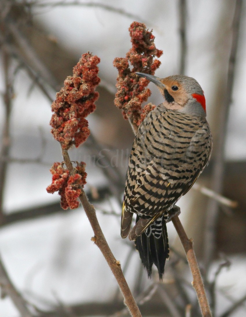 « Northern Flickers eating Staghorn Sumac seeds at Lake Park in Milwaukee Wisconsin on April 17, 2018