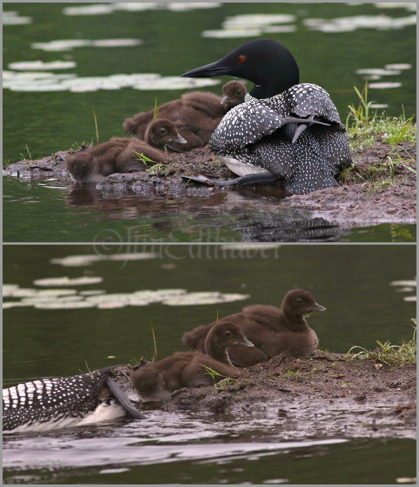 Common Loons, an adult showing the chicks how to crawl up onto the bog in Sawyer Co 6-27-2025